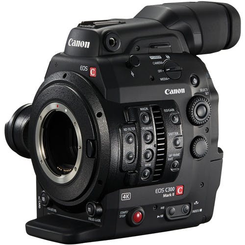 The EF-mount C300 Mark II Cinema EOS Camcorder Body with Dual Pixel CMOS AF features a Super 35mm CMOS. This provides faster and more accurate autofocusing to assist users when operating with small crews.