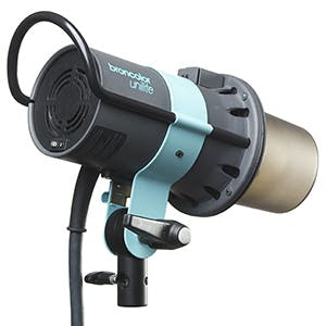 The Broncolor 3200 watt/second Unilite flash head has a sturdy aluminium housing grip, and bayonet mount with automatic lock for interchangeable reflectors and various area lamps. Its plug-in flash tube has a ceramic socket and spring for a secure hold. The flash head can be fitted either with 1600 or 3200 w/s flash tubes. It is also usable with the battery-powered Mobil power pack (without modeling light). A power supply for this flash head is required.
