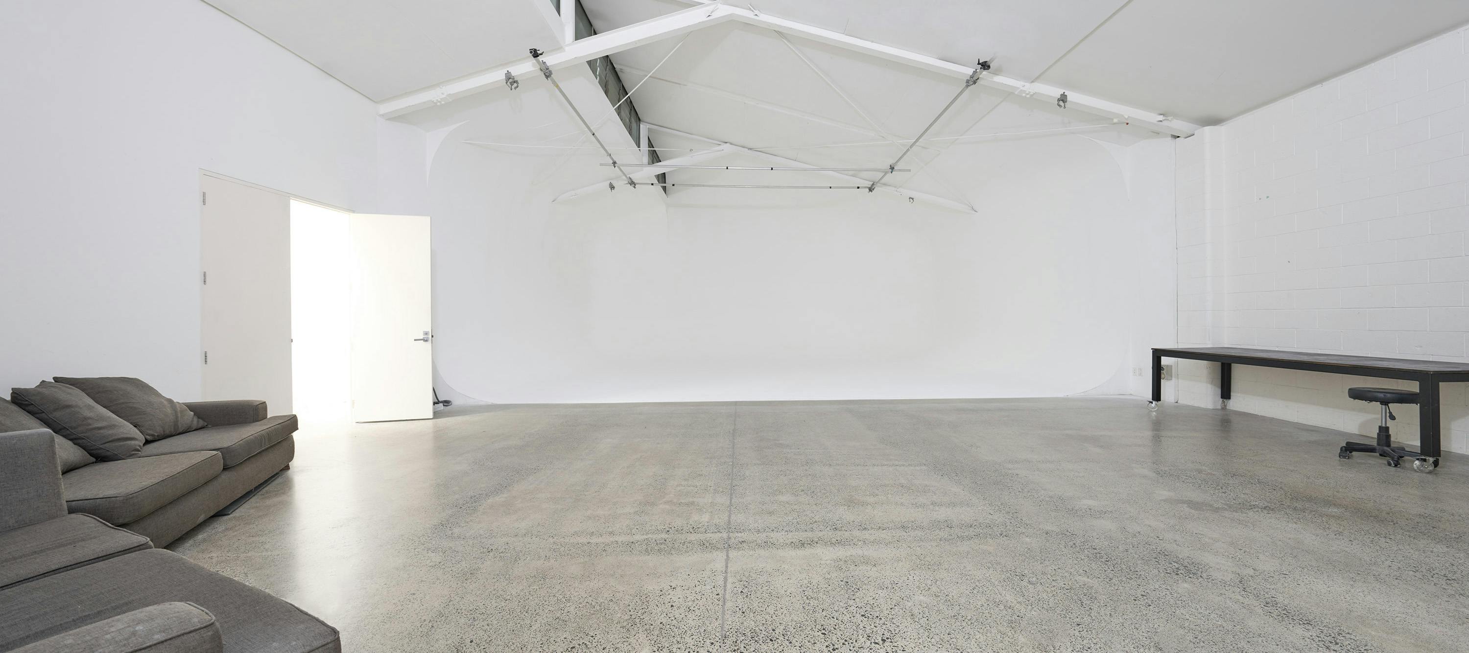 Studio 1's main feature is an 18m (Deep) x 10.5m (Wide) x 5m (High) wrap around infinity cove covering half of the studio section. The other half is polished concrete.