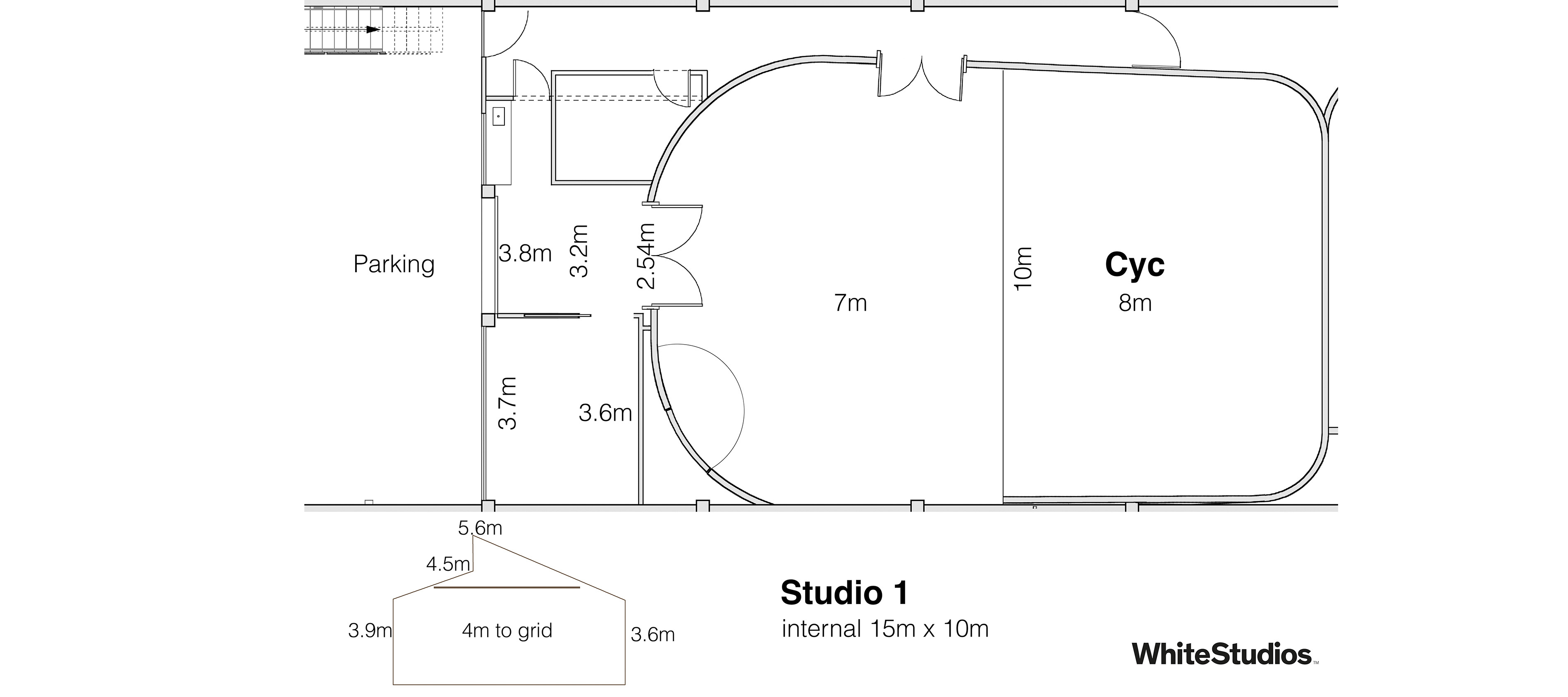 Studio 1's main feature is an 18m (Deep) x 10.5m (Wide) x 5m (High) wrap around infinity cove covering half of the studio section. The other half is polished concrete.